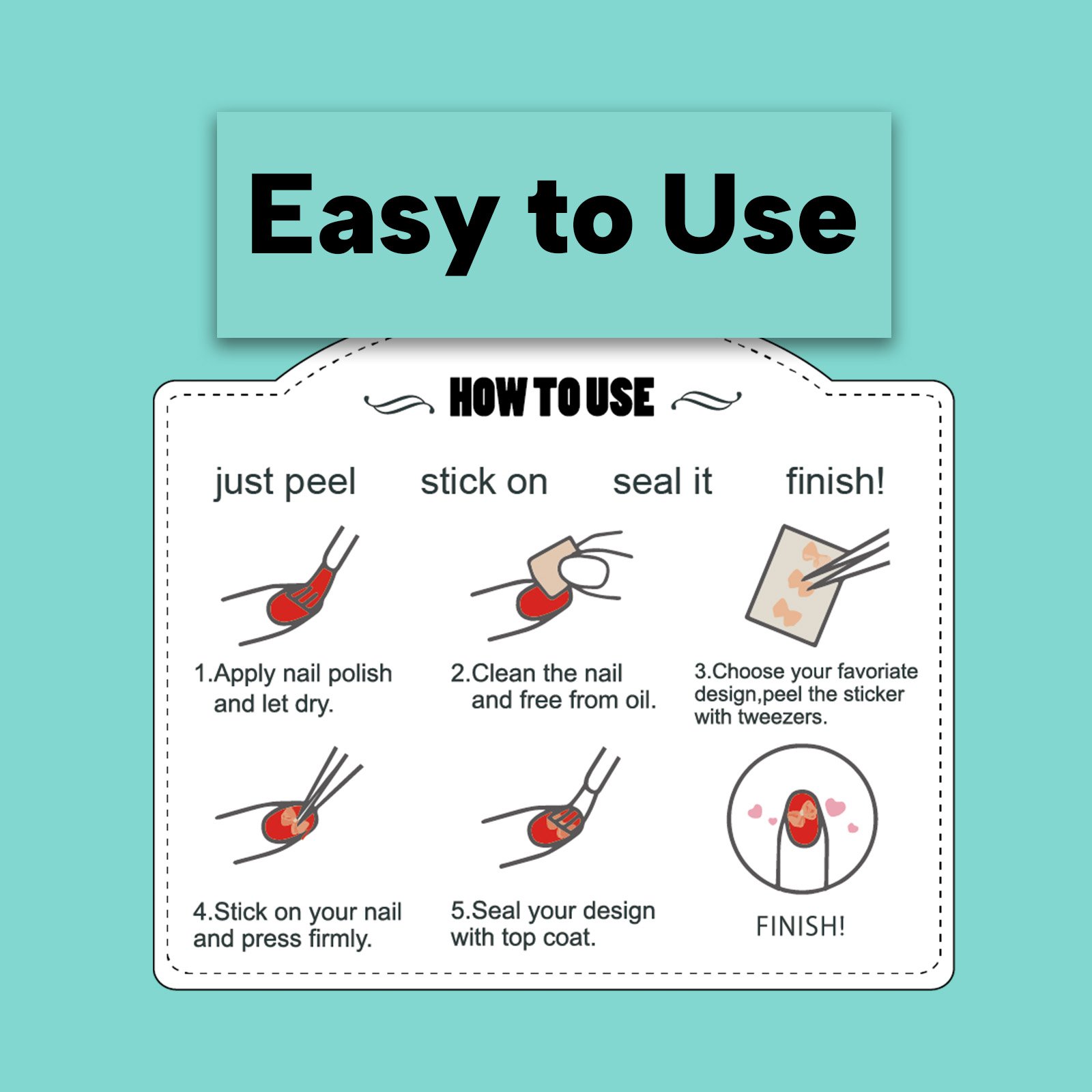 • 【How to Use】:1.Apply nail polish and let dry with a light.2.Clean the nail and free from oil.3.Choose your favoriate design,peel the self-adhesive sticker with tweezers.4.Stick on your nail and press firmly.5.Seal your design with top coat for lasting longer.